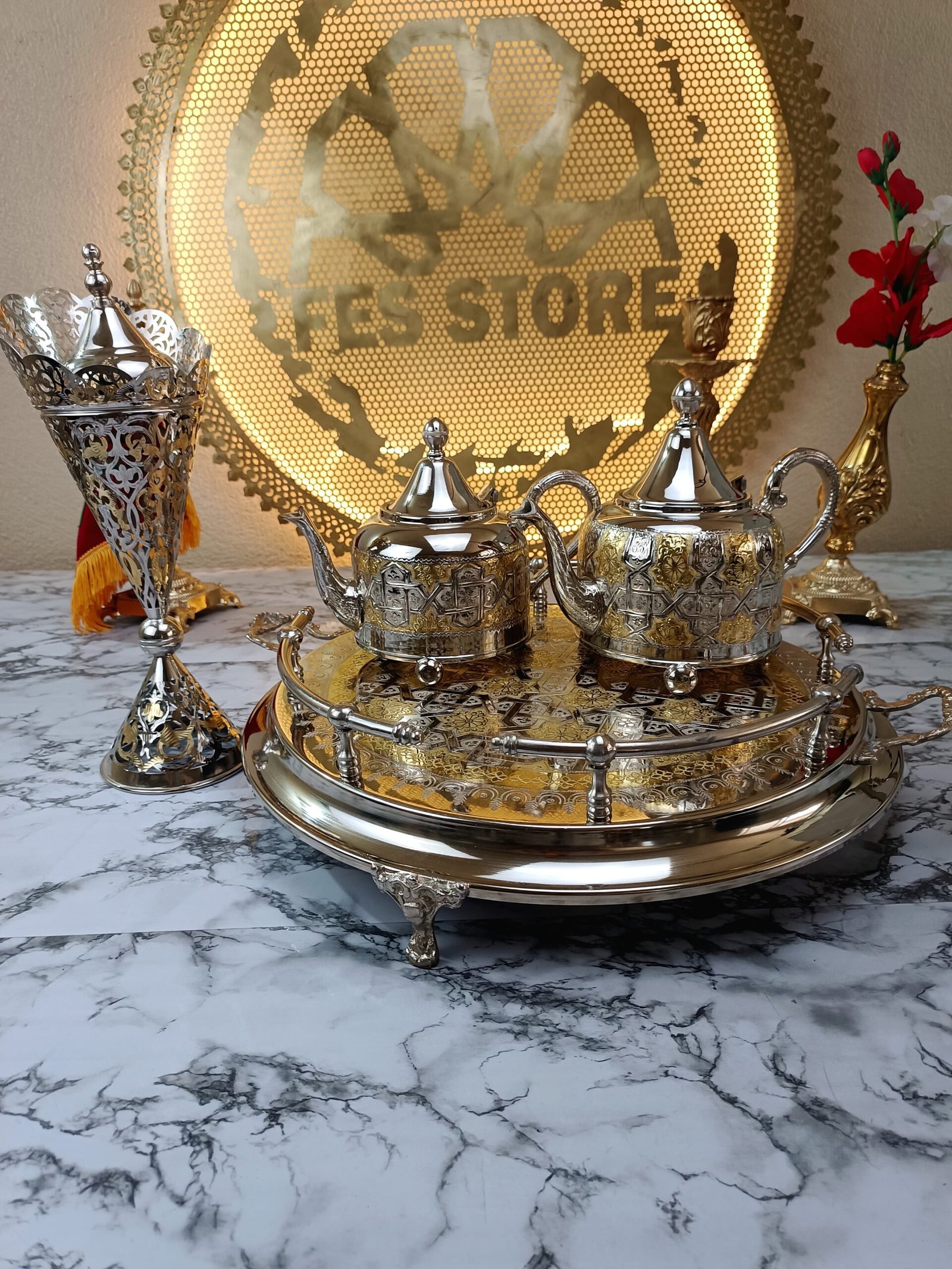 La théière Flora incarne l’élégance de l’artisanat marocain. Ornée de gravures fines en argent et dorures subtiles, elle allie tradition et prestige. Sa forme arrondie et son éclat majestueux en font bien plus qu’un simple objet : une pièce de réception digne des plus belles tables. Idéale pour servir le thé avec raffinement.