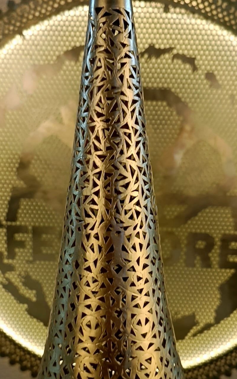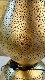 Apportez une touche d’authenticité et de raffinement à votre intérieur avec cette lampe marocaine en cuivre massif, finement travaillée à la main avec la technique traditionnelle de perforation ajourée.