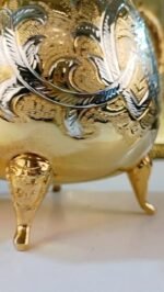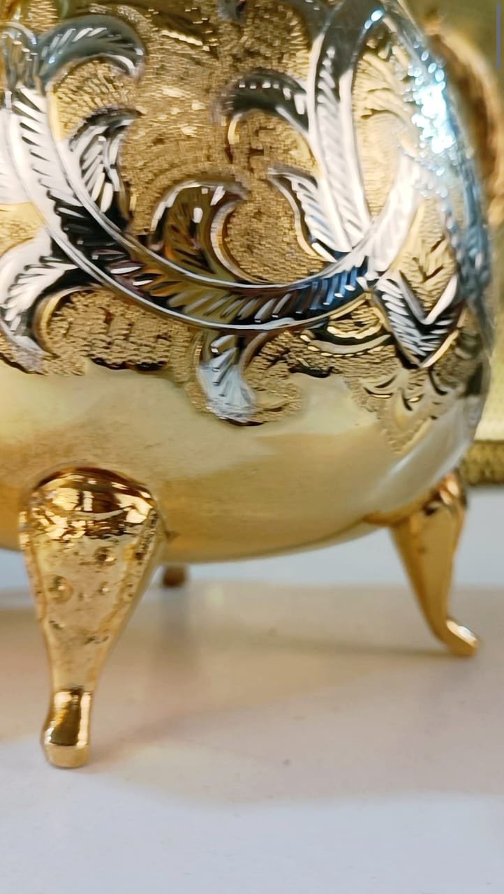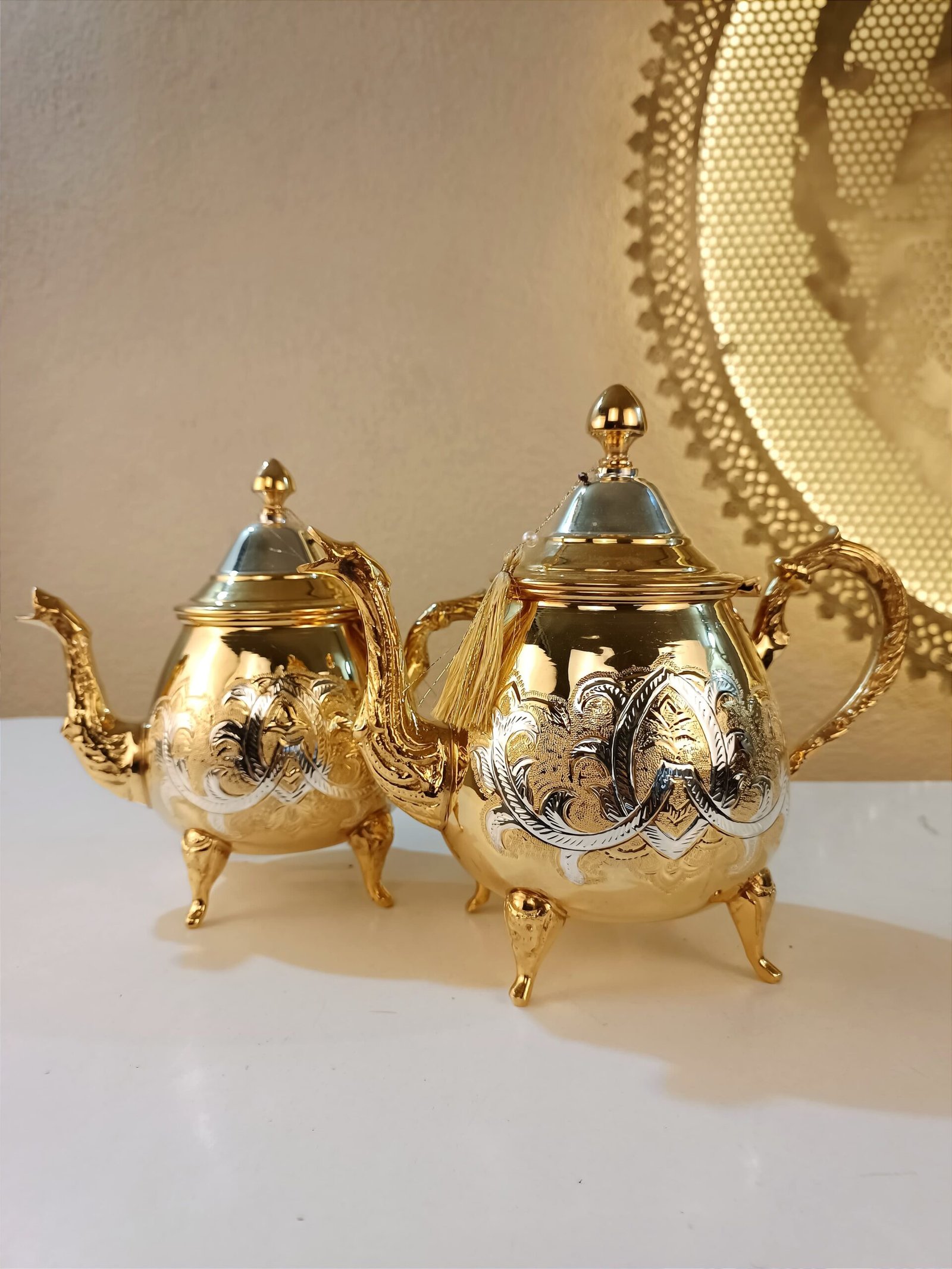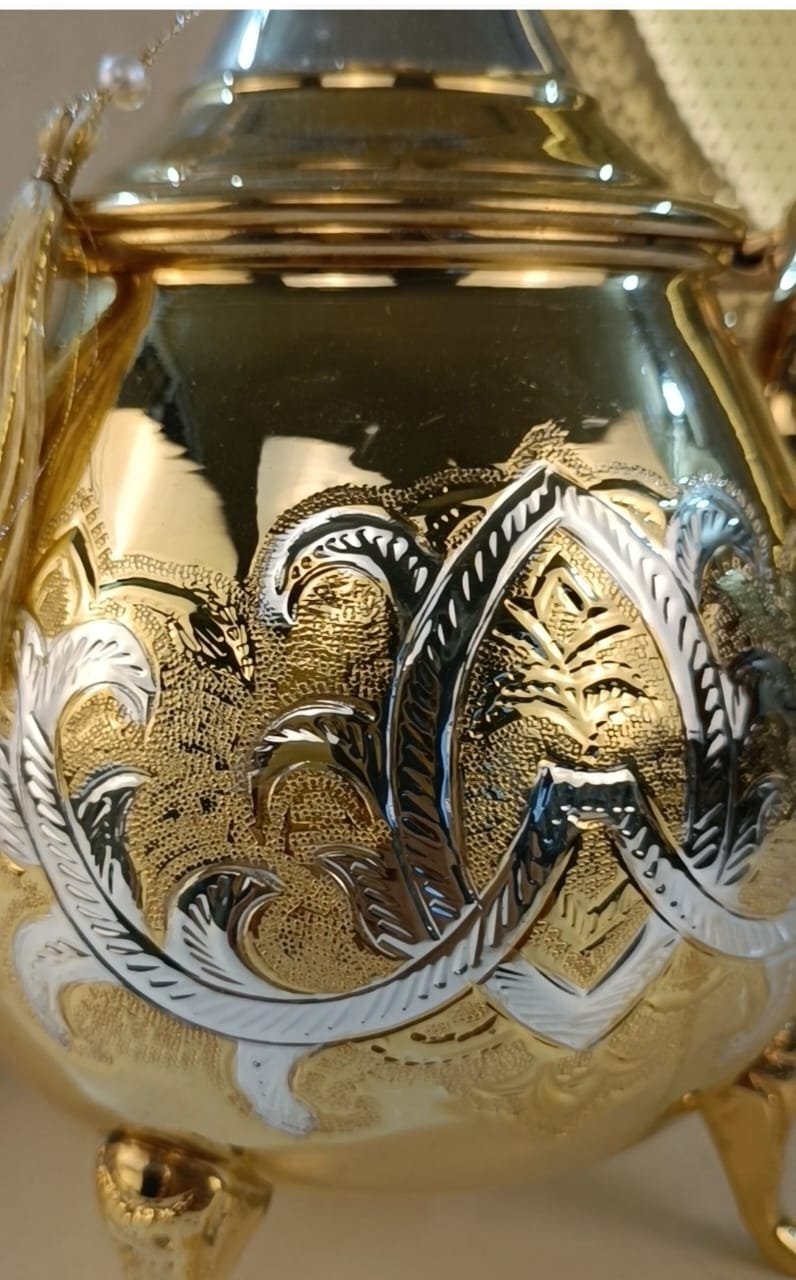 Élégante théière marocaine artisanale , ornée d’un motif gravé traditionnel (zowa9 beldia) et d’un superbe mélange d’argent et d’or.