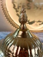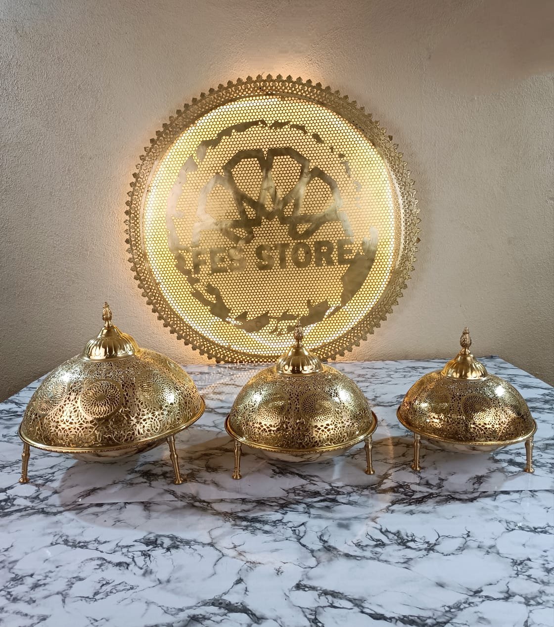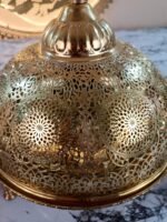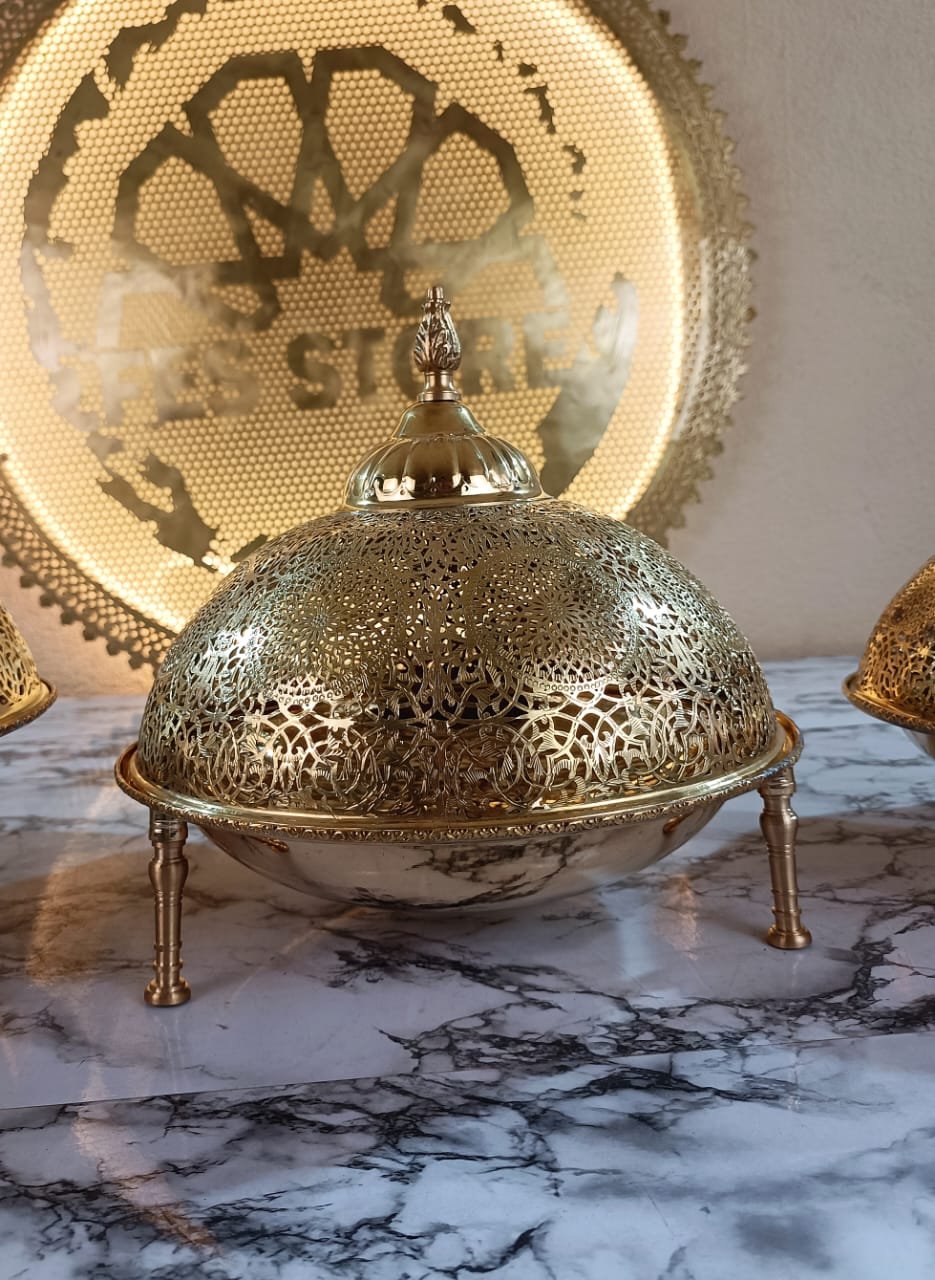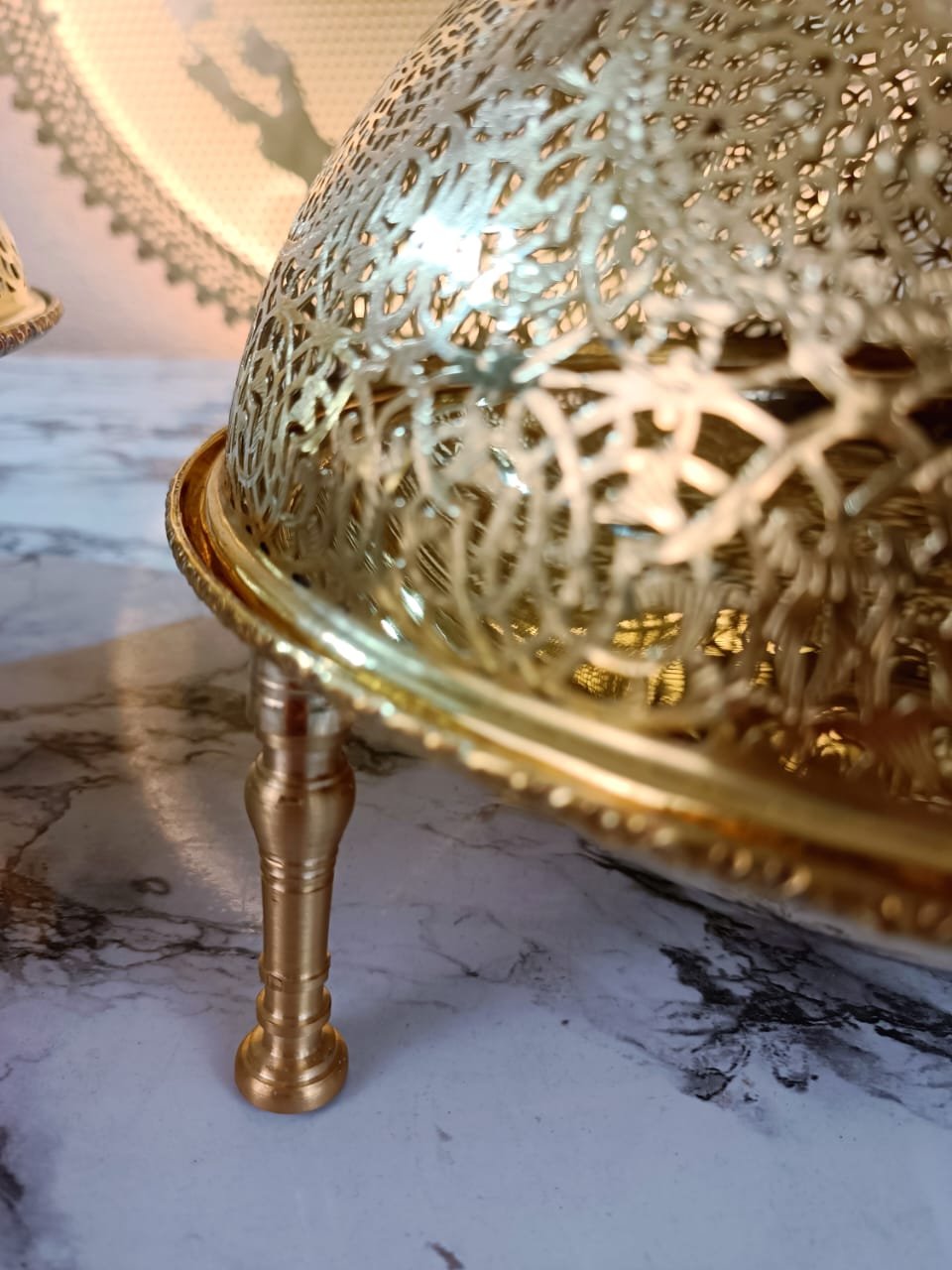 Entièrement travaillée à la main avec la technique du takhrem marocain, elle laisse filtrer la lumière et sublime chaque table par son raffinement. Sa finition dorée lui confère un éclat royal, parfait pour les grandes occasions.