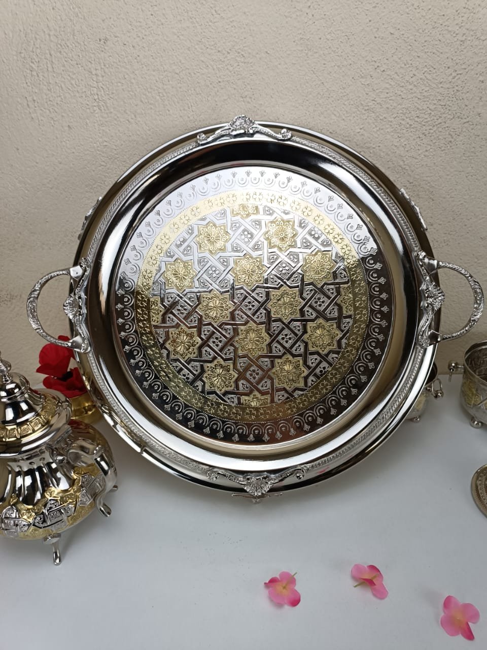 Be the first to review “Plateau Marocain Gravé Argent et Doré”
