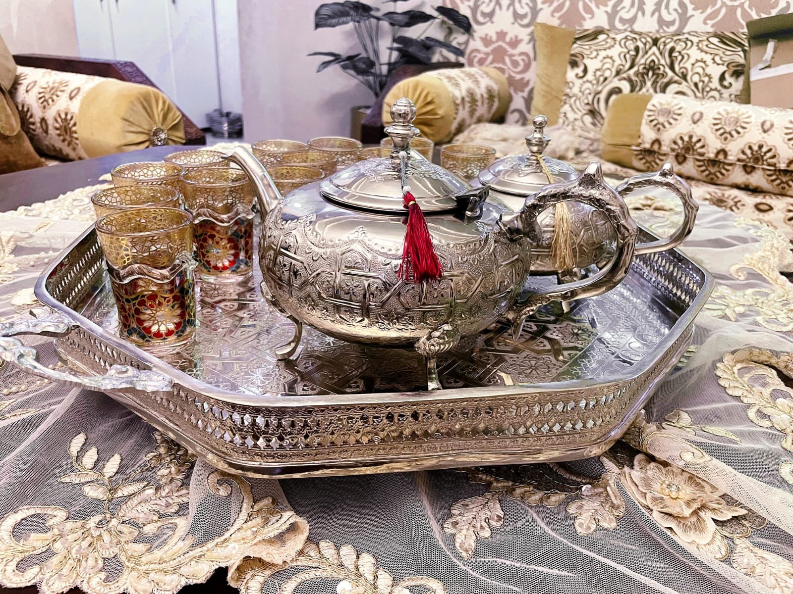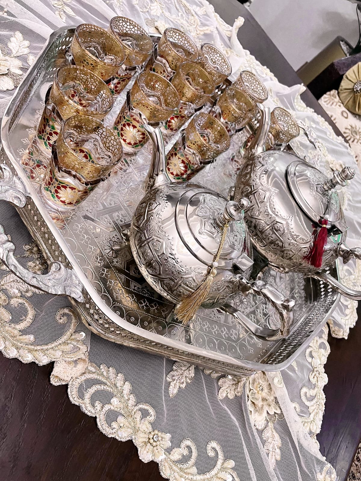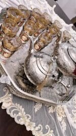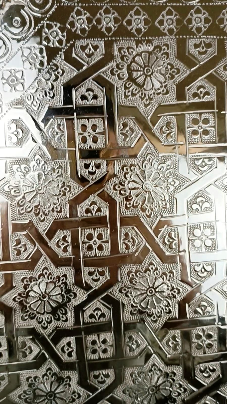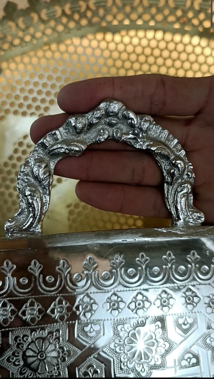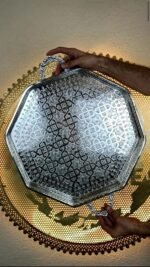 Un plateau artisanal d’exception, façonné en cuivre massif et recouvert d’une finition nickelée brillante. Son décor ciselé à la main révèle des motifs géométriques traditionnels, témoignant du savoir-faire ancestral des artisans de Fès.