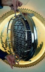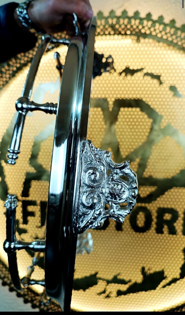 Cette sniya traditionnelle marocaine en laiton argenté séduit par sa forme parfaitement ronde et son motif sculpté « dama», emblématique de l’élégance artisanale.