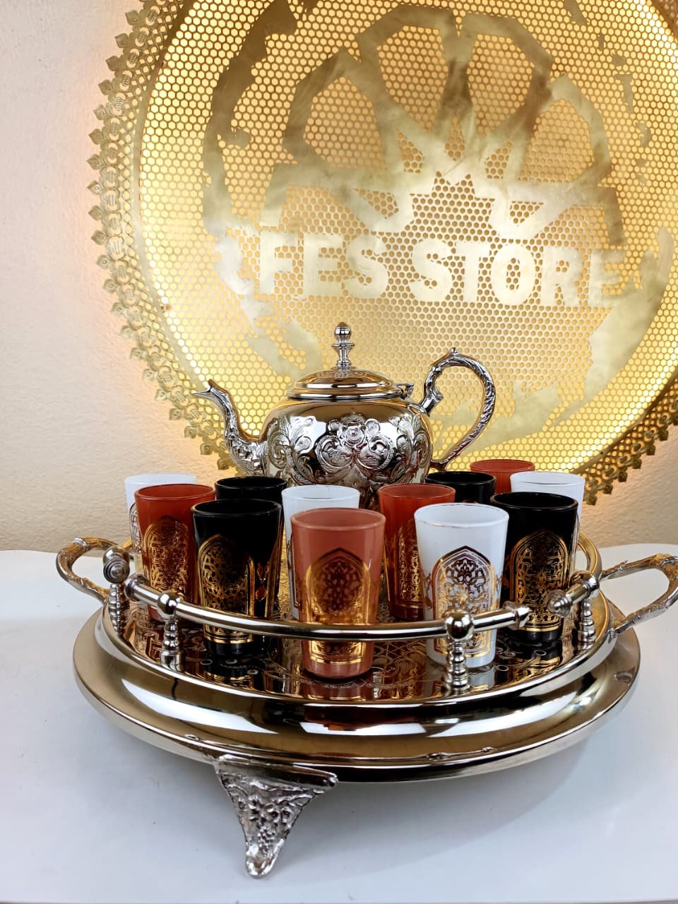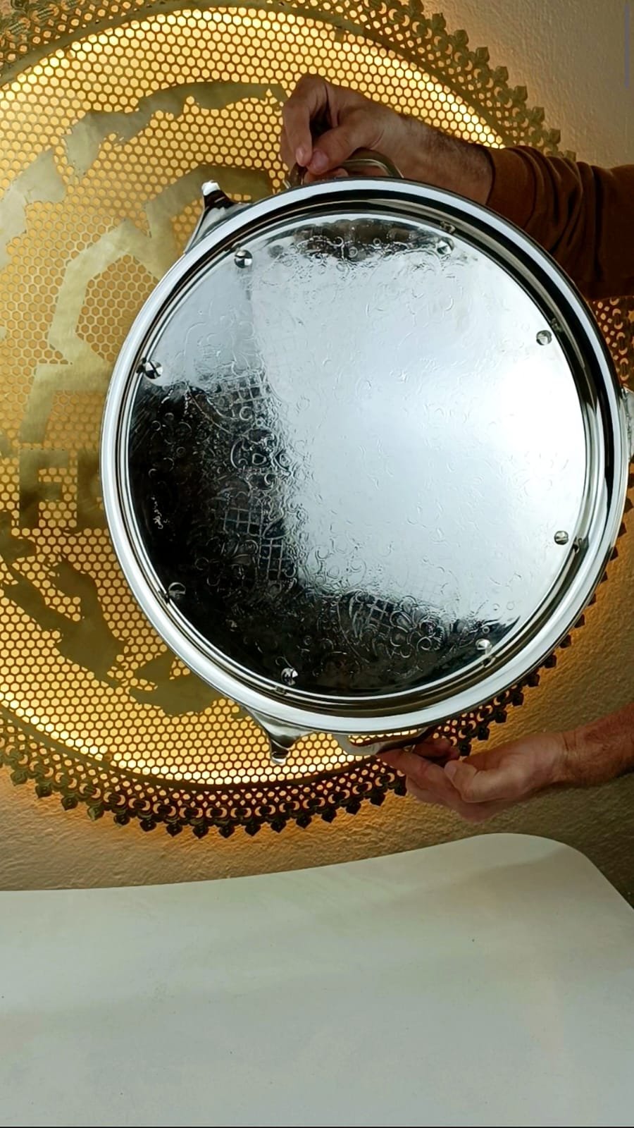 Cette sniya traditionnelle marocaine en laiton argenté séduit par sa forme parfaitement ronde et son motif sculpté « Raïd », emblématique de l’élégance artisanale.