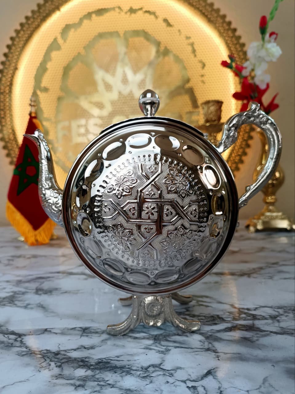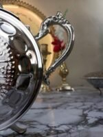 Découvrez la théière “El Makana”, une pièce unique qui marie avec élégance le design moderne et le savoir-faire artisanal marocain. Fabriquée à la main en cuivre finement gravé, elle reflète la richesse de l’art de Fès tout en apportant une touche contemporaine à votre service à thé.